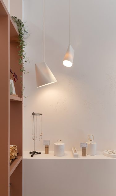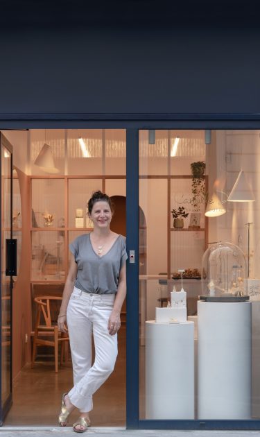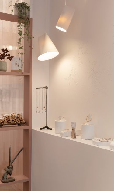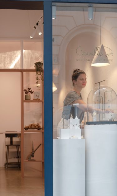 Je remercie Gaëlle Joly avec qui nous avons collaborer sur ce projet pour mettre en place la jolie fresque de plâtre en dentelle sur le mur principal de la boutique. Ce travail subtil fait écho aux bijoux de dentelles de Camille.