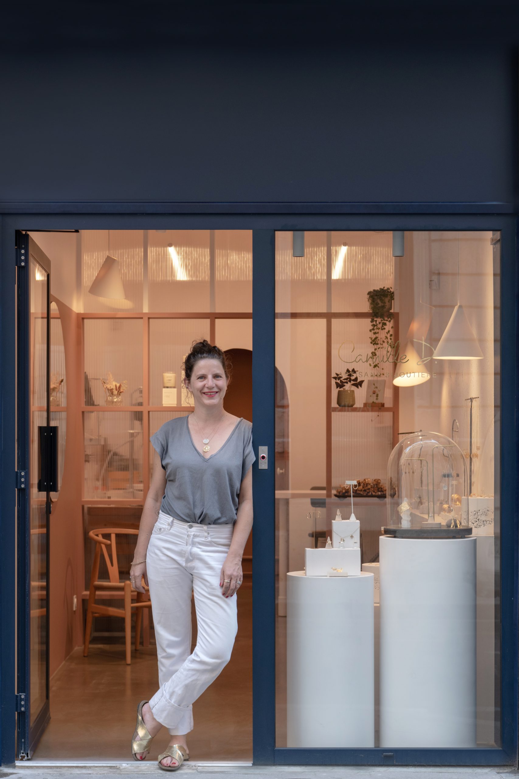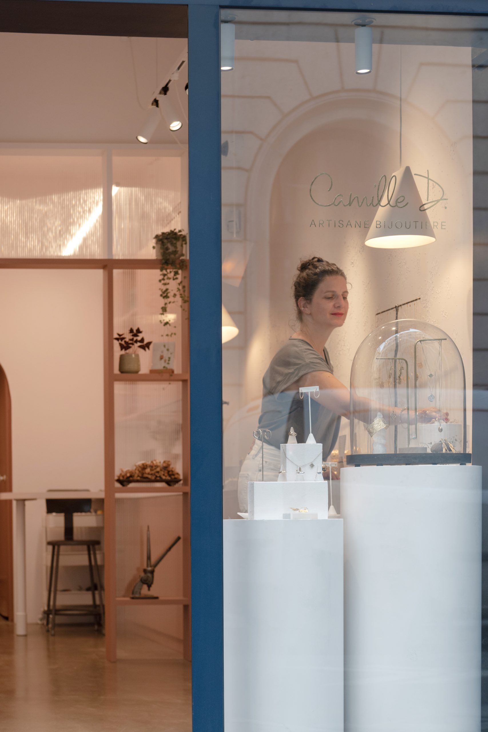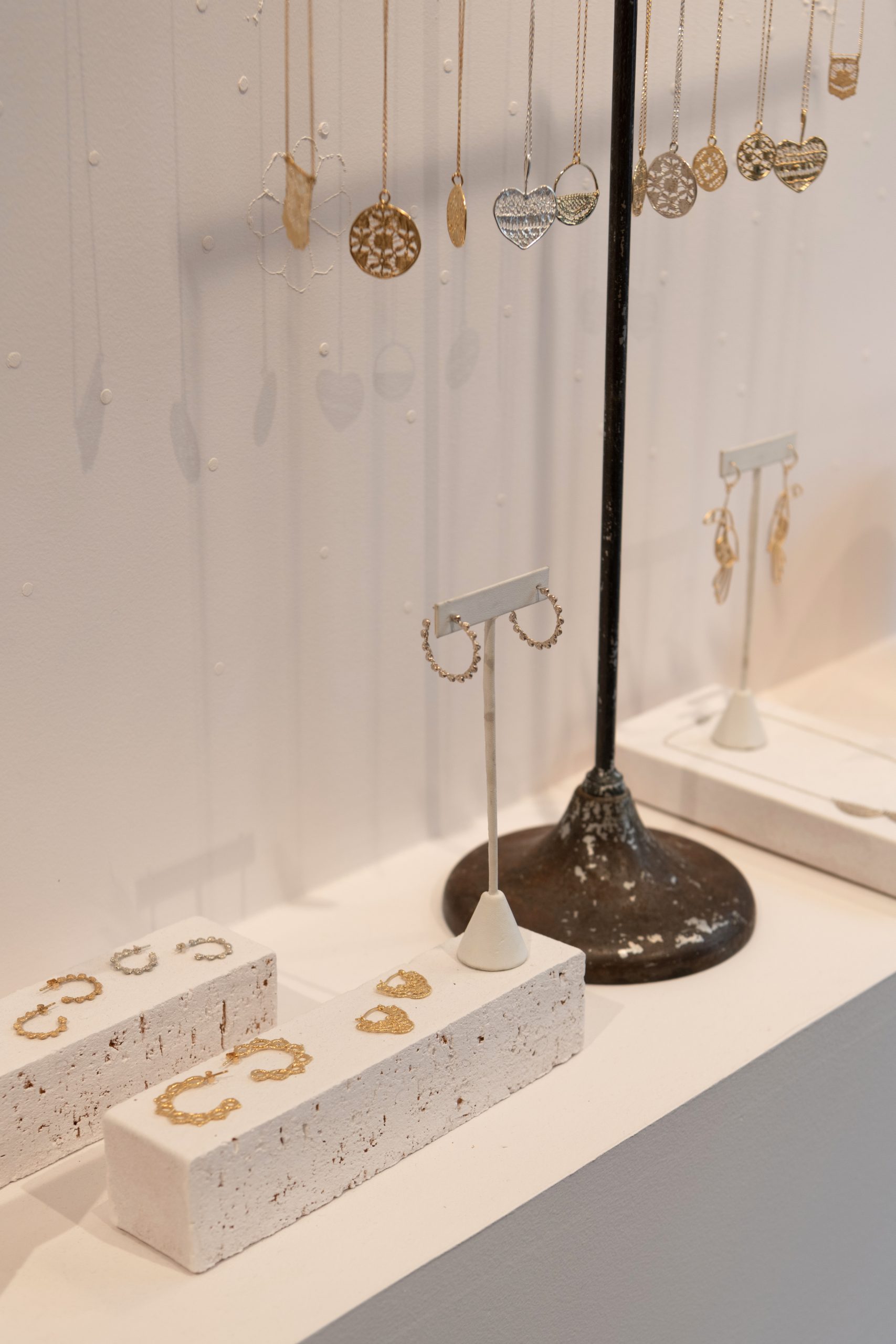 Je remercie Gaëlle Joly avec qui nous avons collaborer sur ce projet pour mettre en place la jolie fresque de plâtre en dentelle sur le mur principal de la boutique. Ce travail subtil fait écho aux bijoux de dentelles de Camille.
