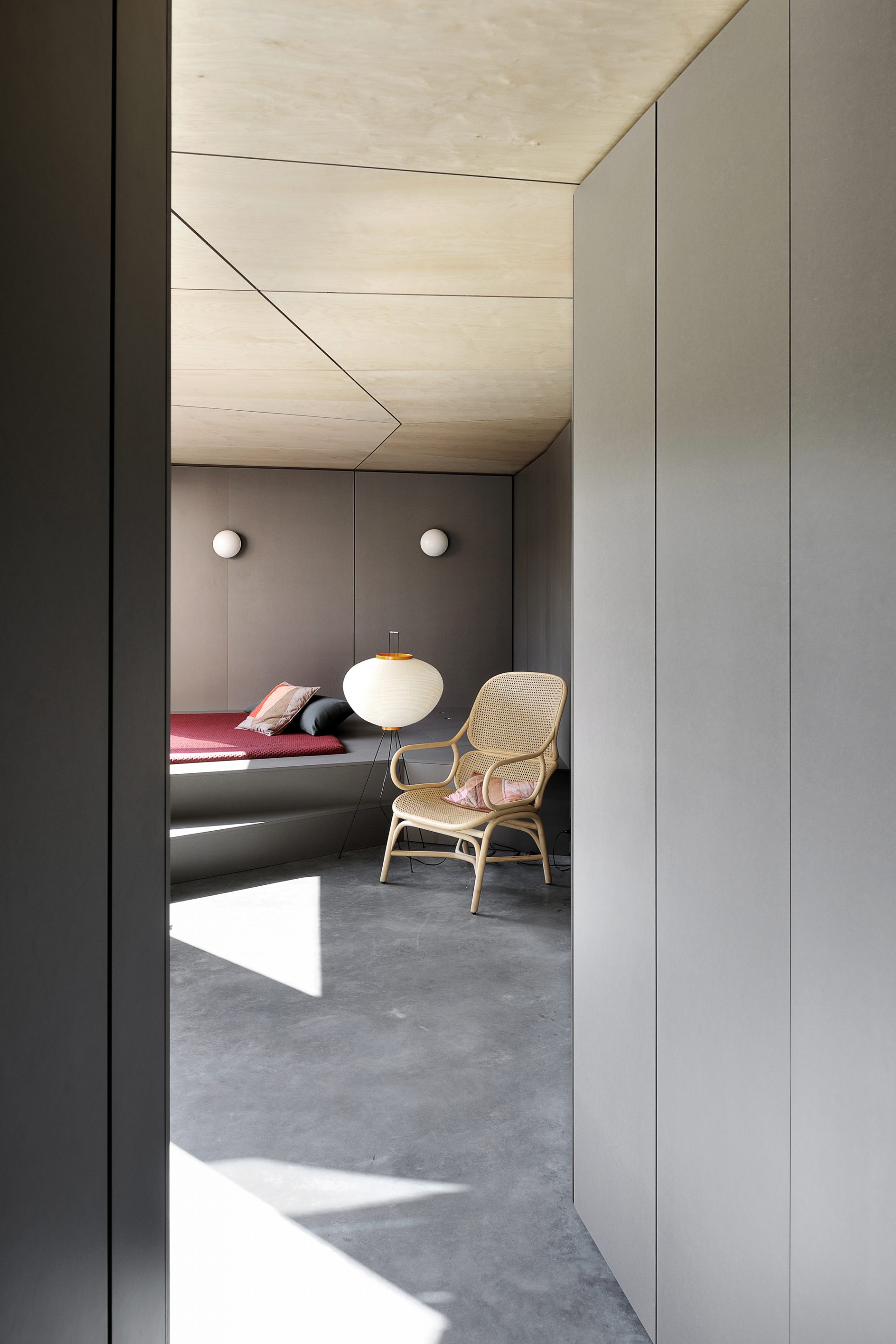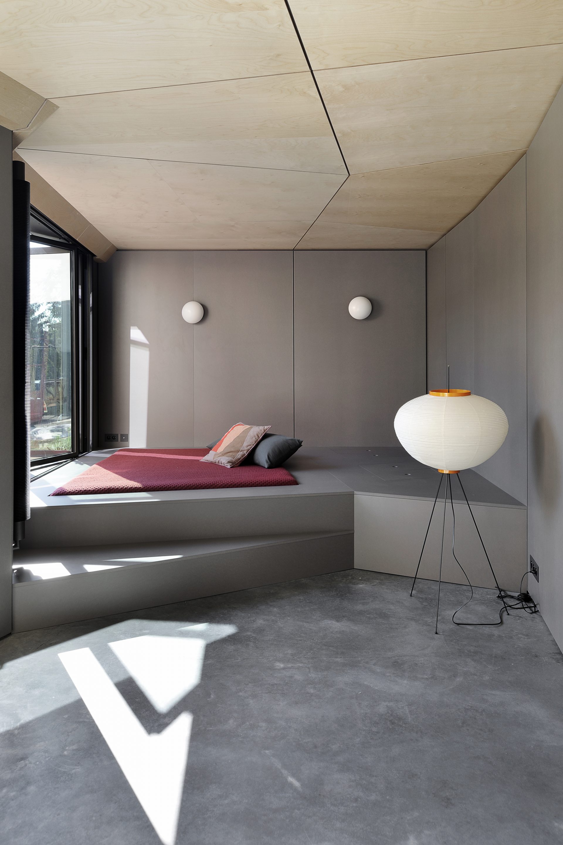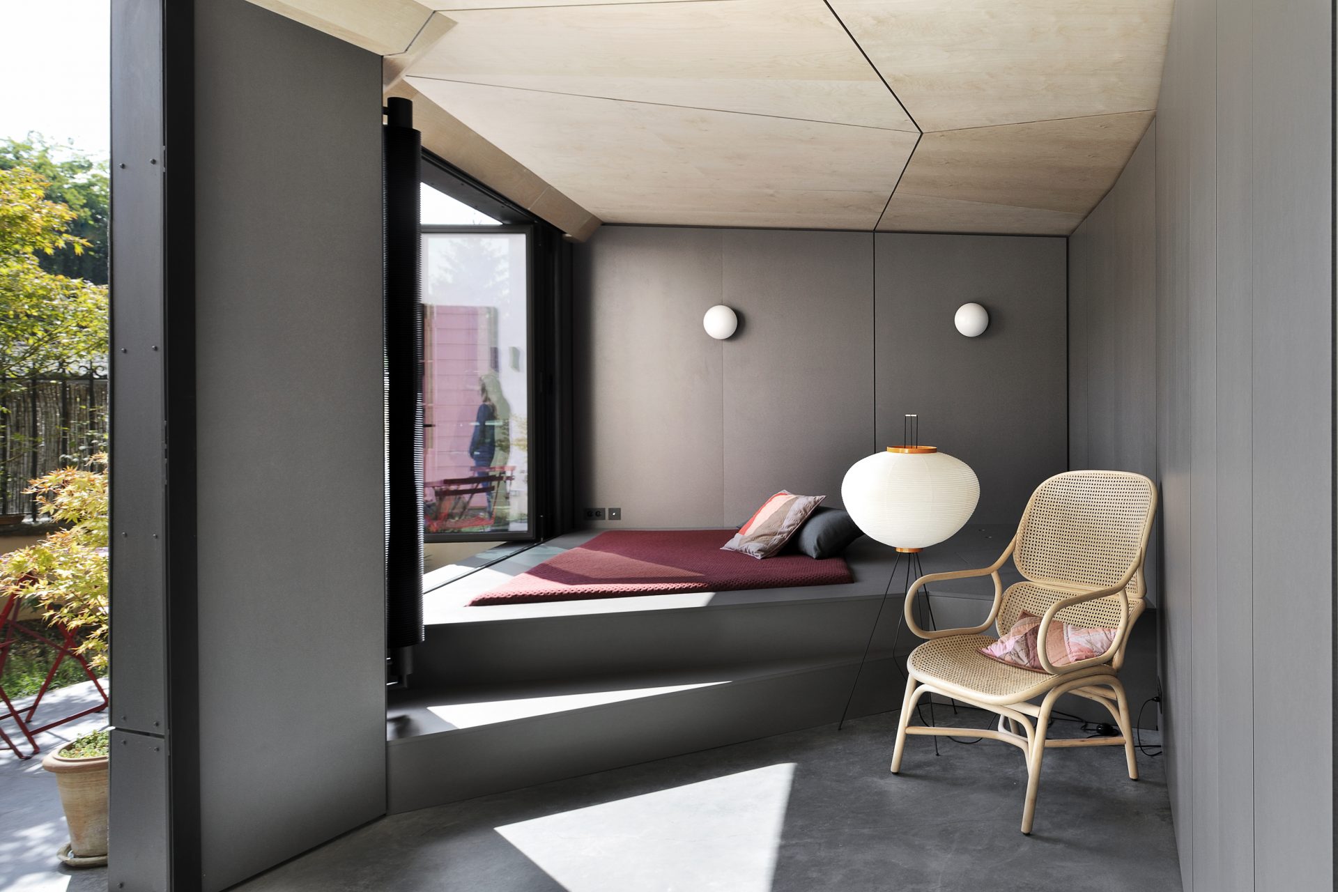 A l’intérieur du volume crée, l’ensemble de la pièce a été dessinée avec des lignes coupées tel un origami en bois.