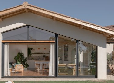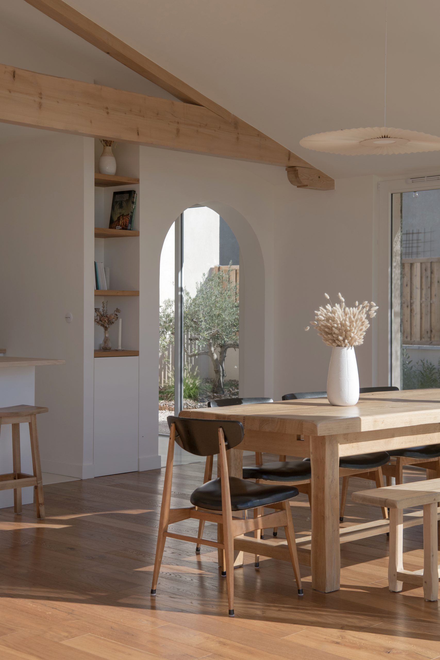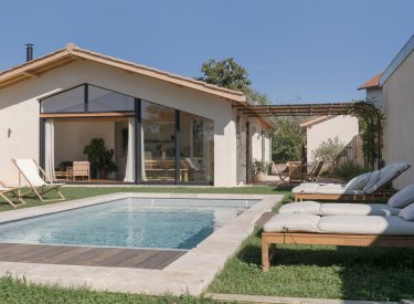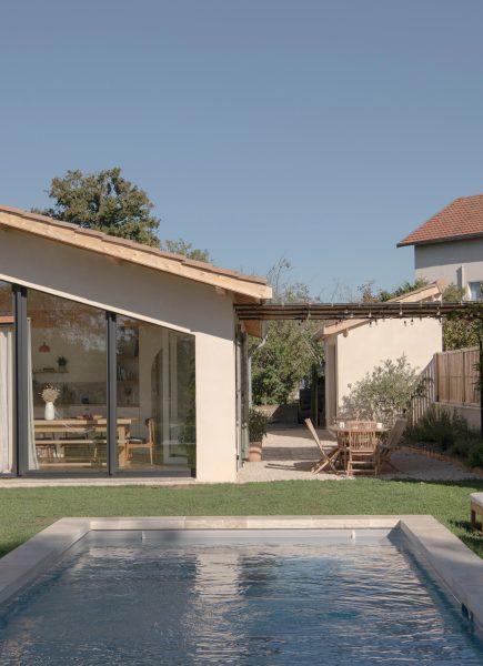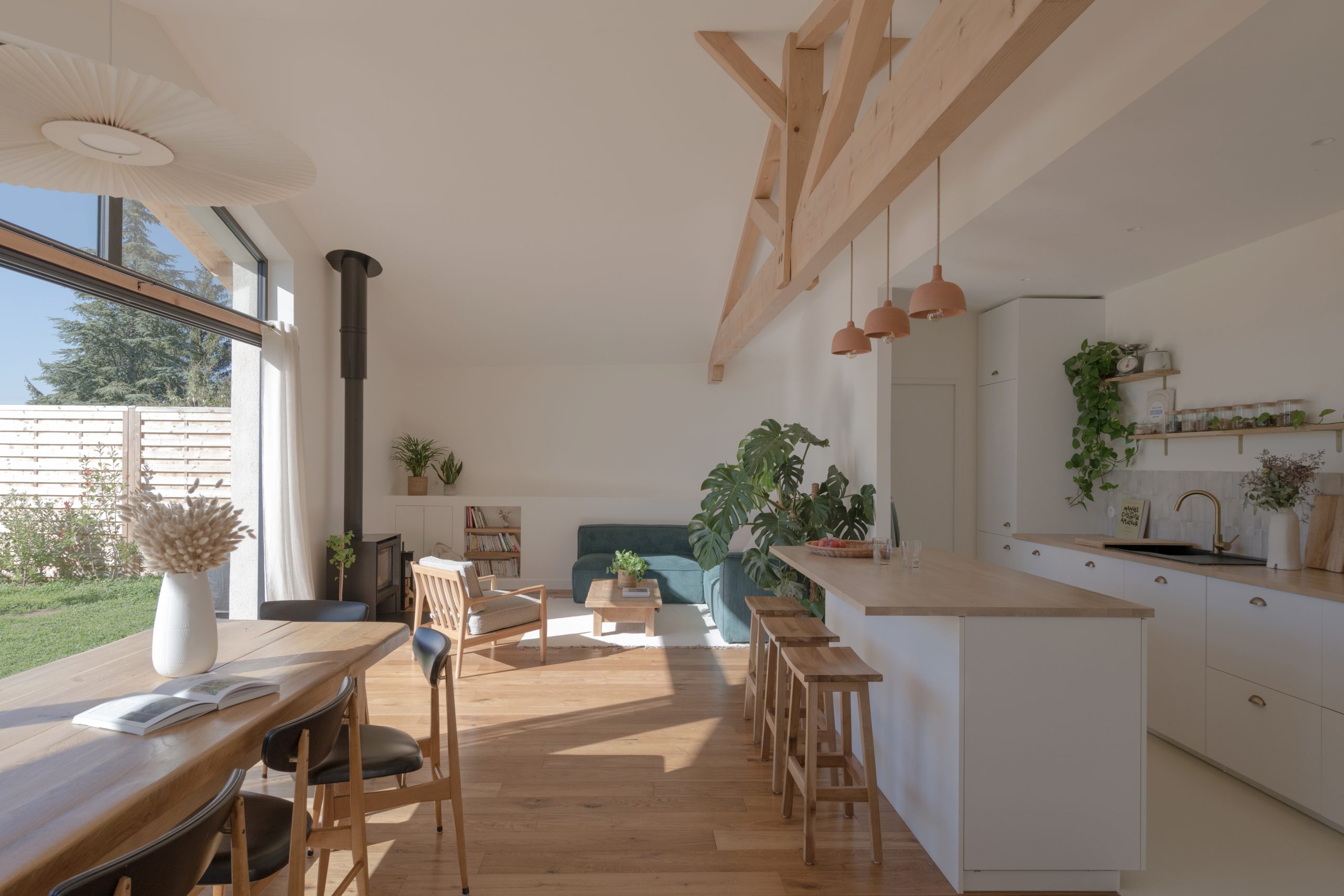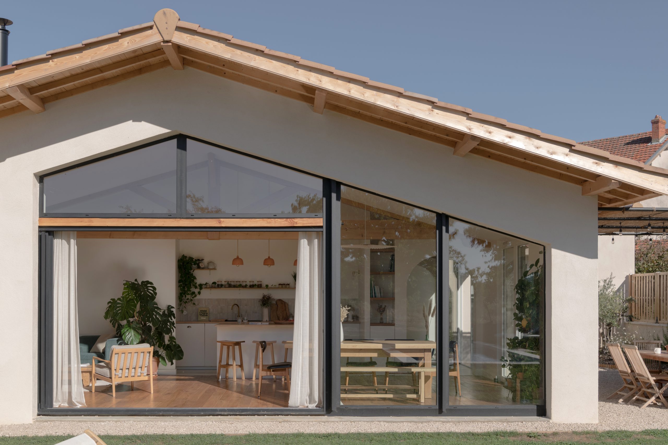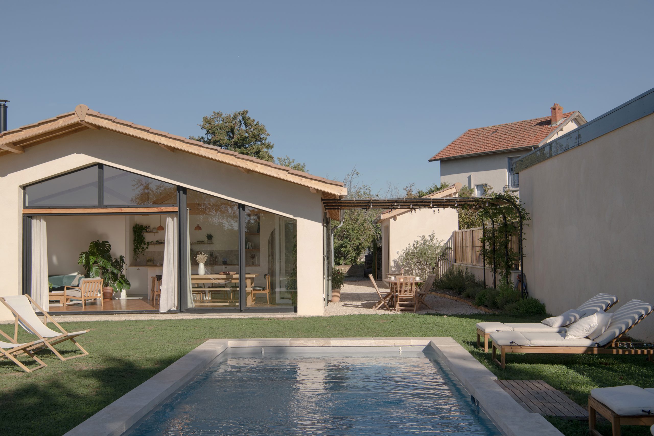 Construction d'une maison neuve de plain pied sur la commune de Chasselay dans l'ouest de Lyon. Cette maison avec un air de vacances se développe sur 130 m2 habitable et propose des espaces de vie largement ouverts sur le jardin et la vue. Le projet met en scène une belle charpente en bois.