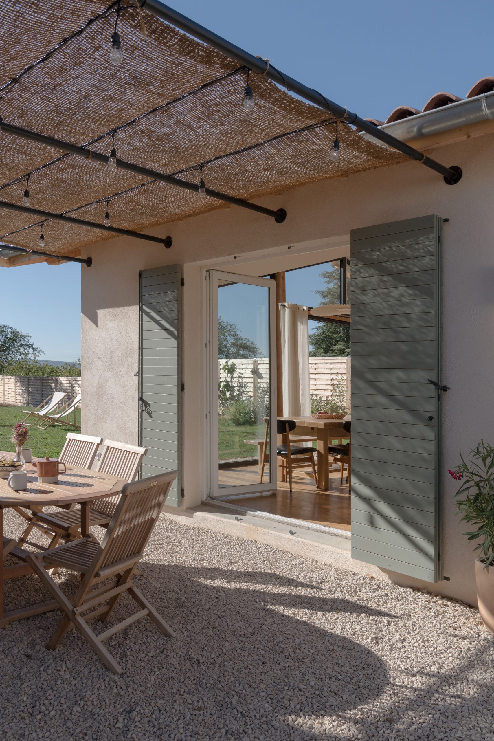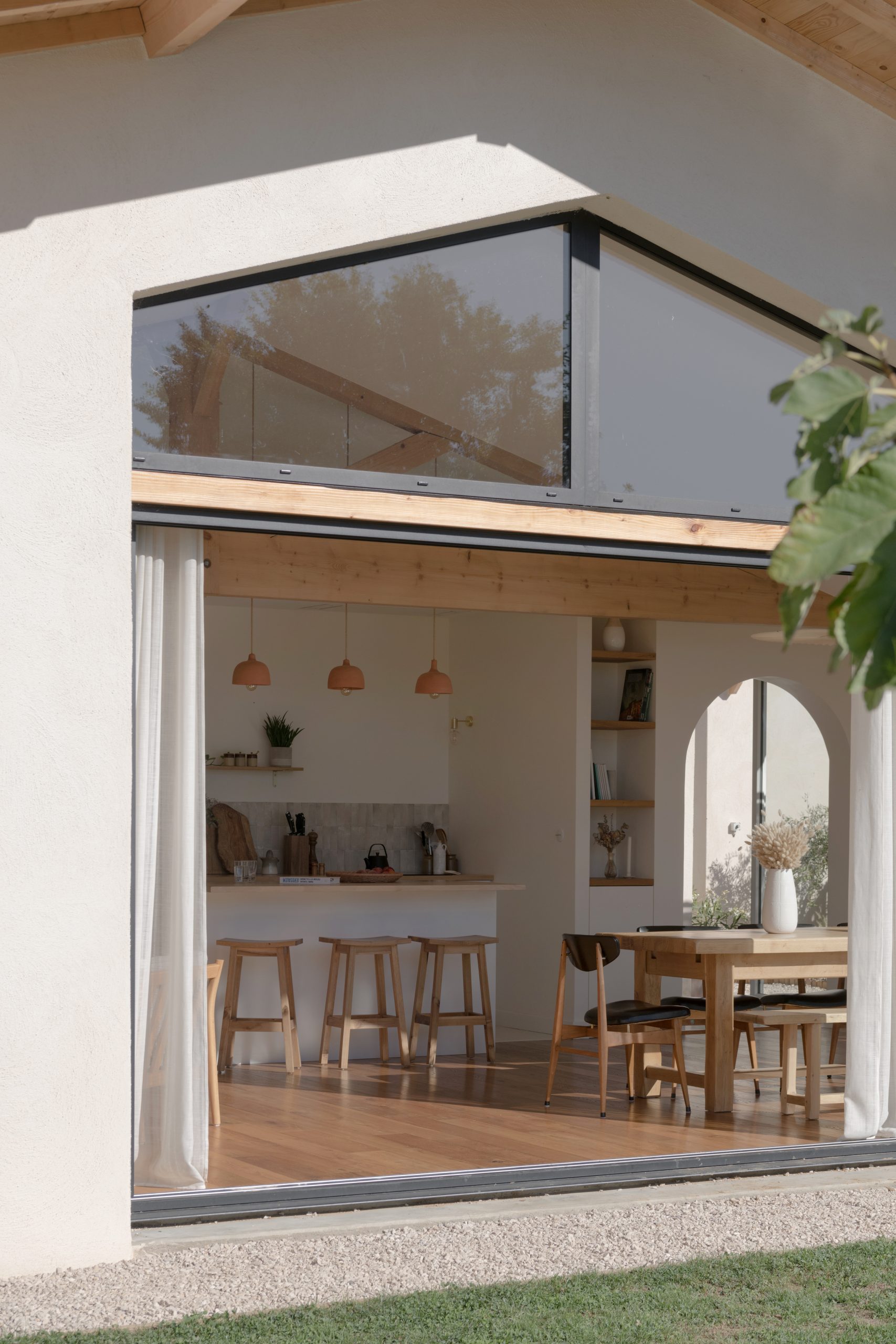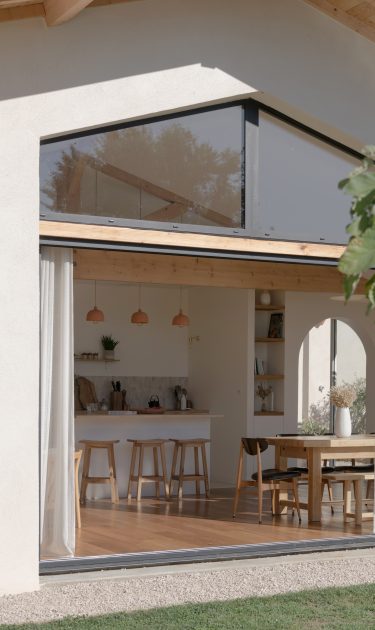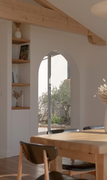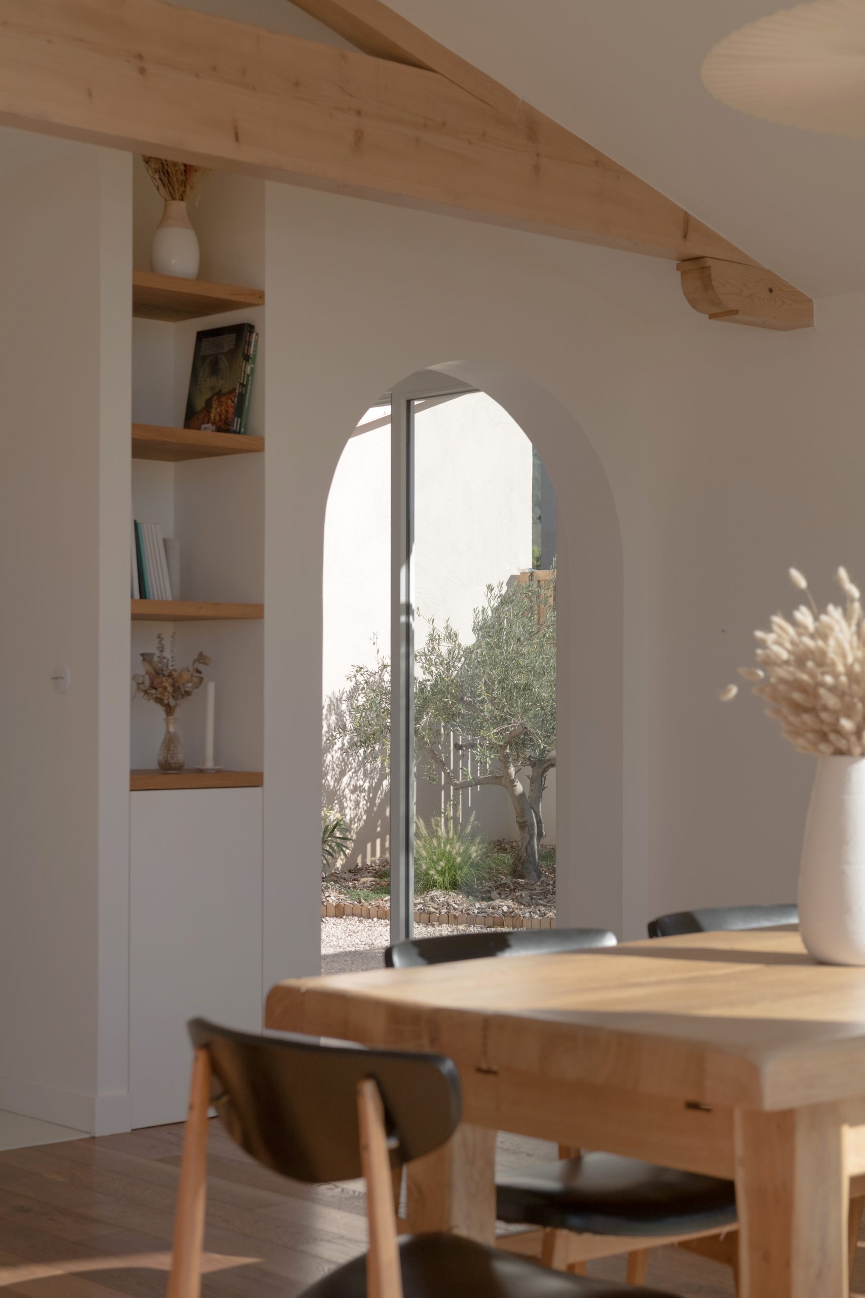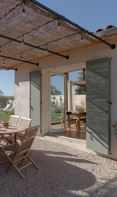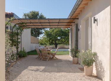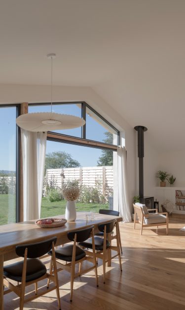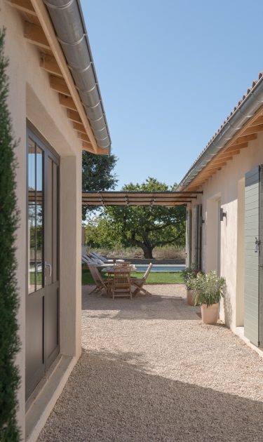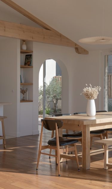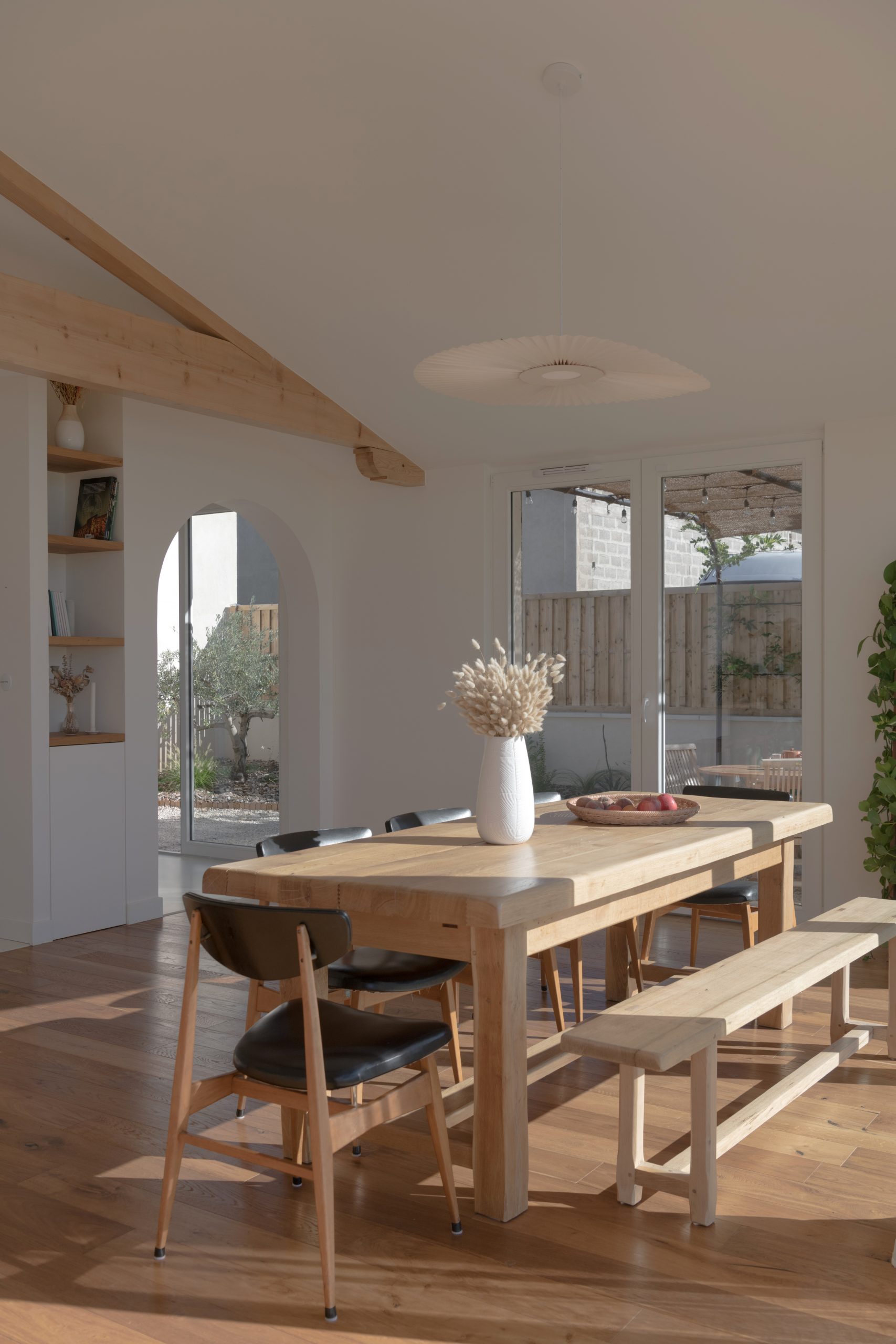 Construction d'une maison neuve de plain pied sur la commune de Chasselay dans l'ouest de Lyon. Cette maison avec un air de vacances se développe sur 130 m2 habitable et propose des espaces de vie largement ouverts sur le jardin et la vue. Le projet met en scène une belle charpente en bois.