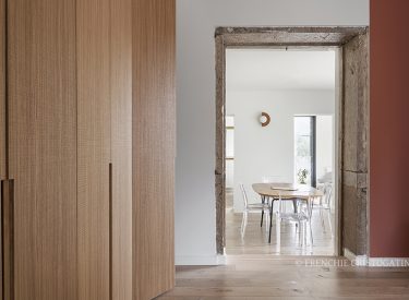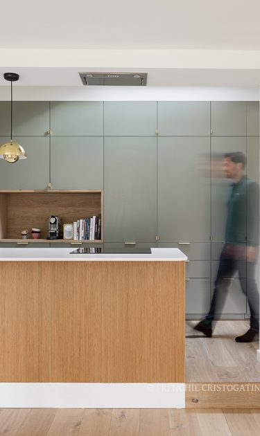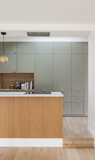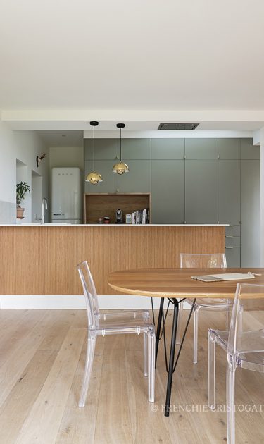 A l’intérieur du volume crée, l’ensemble de la pièce vient en prolongement des espaces cuisine et salle à manger qui se trouvent dans la maison existante.