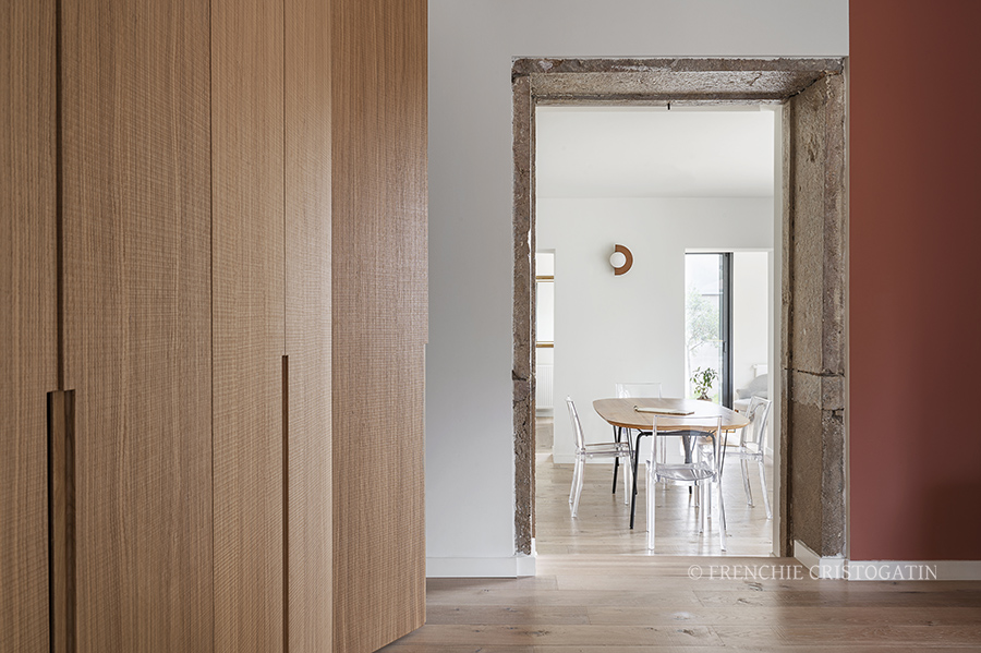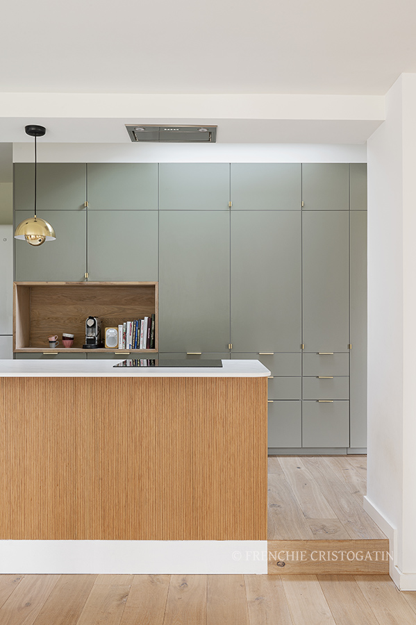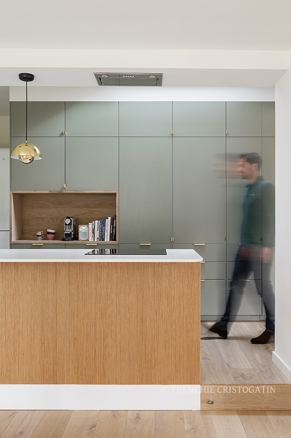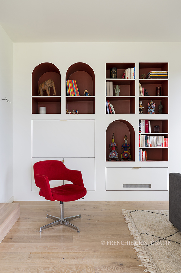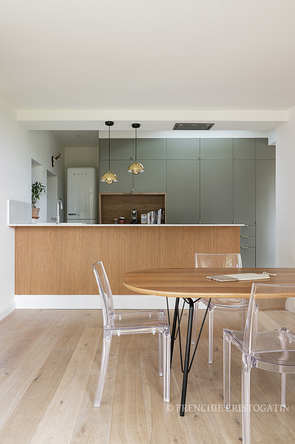 A l’intérieur du volume crée, l’ensemble de la pièce vient en prolongement des espaces cuisine et salle à manger qui se trouvent dans la maison existante.